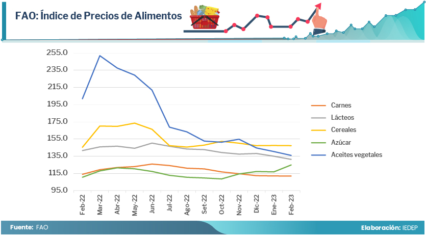 En enero pasado, se cumplieron once meses consecutivos desde marzo del 2022, que el índice de precios de alimentos de la Organización de las Naciones Unidas para la Agricultura y la Alimentación – FAO viene descendiendo, acumulando una caída de 18,7%. En dicho índice se analizan los comportamientos de los precios de aceites vegetales y lácteos, que registraron la mayor caída; cereales y carne, con una menor reducción y compensando el incremento en el precio del azúcar.
