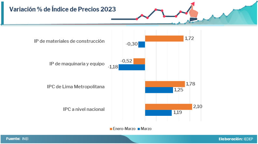 Otro indicador publicado por el INEI, es el Índice de Precios de Materiales de Construcción (IPMC), que mide los cambios en los precios de diez insumos que se utilizan en la actividad constructora. En el primer trimestre del año, la inflación fue de 1,72% en donde seis insumos mostraron una caída y los cuatro restantes un incremento.