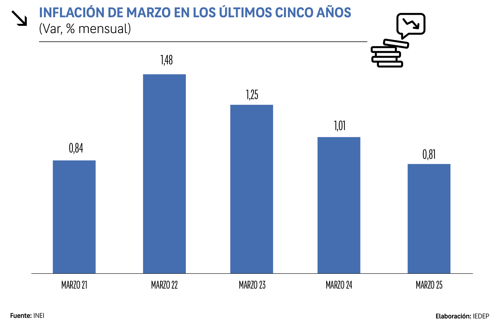En marzo del 2025, el Índice de Precios al Consumidor (IPC) alcanzó una tasa mensual de 0,81 %, mientras que la interanual se situó en 1,3 %, disminuyendo respecto al 1,5 % registrado en febrero. Esta cifra confirma la tendencia decreciente observada en los últimos cinco años, desde el 1,48 % de marzo del 2022 hasta el actual 0,81 %.