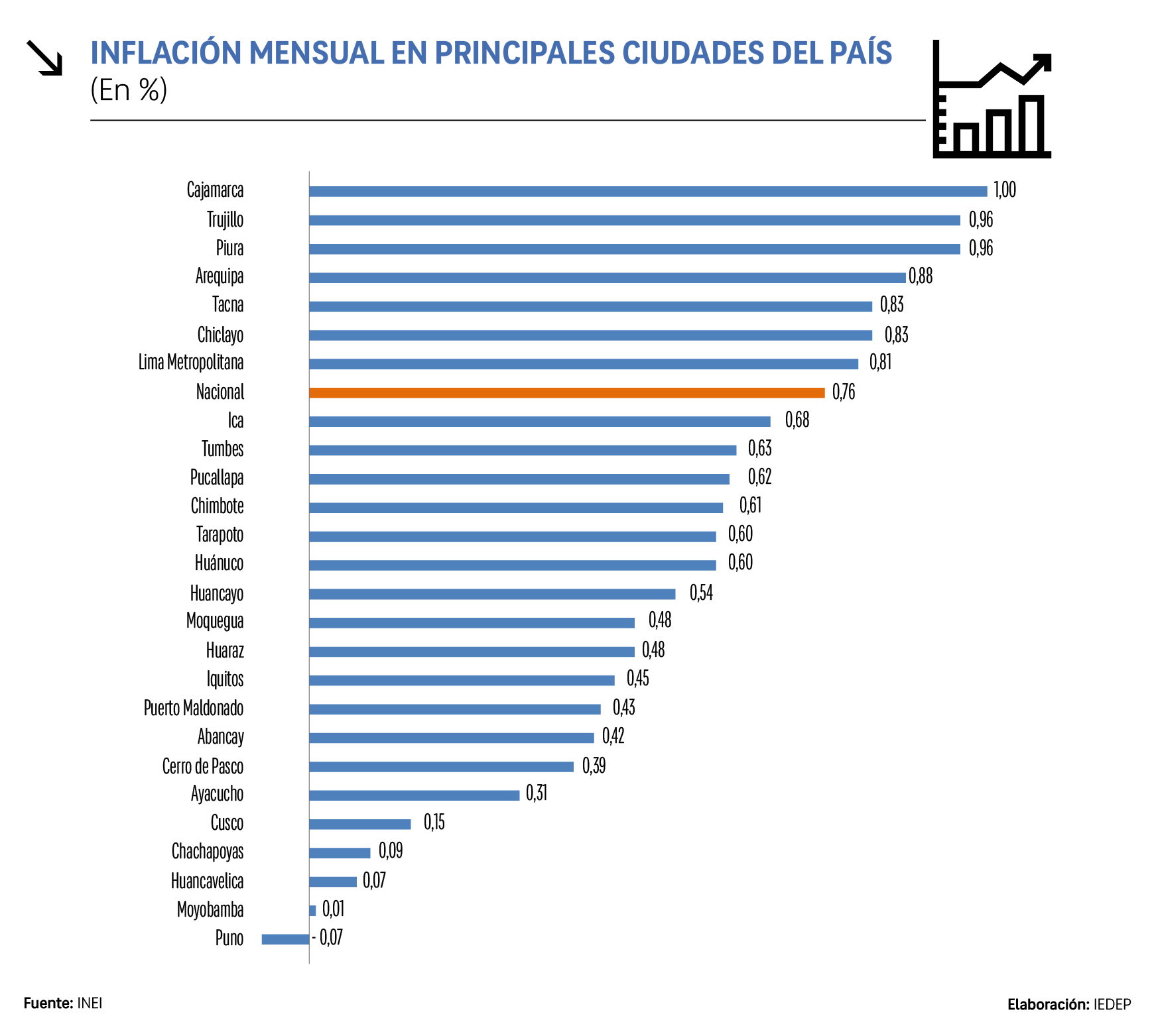 A nivel departamental, Cajamarca encabezó el alza de precios con una inflación del 1 %, seguida por Trujillo y Piura (0,96 % respectivamente), y Arequipa, (0,88 %). El promedio nacional fue de 0,76 %. En el otro extremo, Puno fue la única región con una variación negativa (-0,07 %). Otras ciudades como Moyobamba (0,01 %), Huancavelica (0,07 %) y Chachapoyas (0,09 %) registraron incrementos mínimos, próximos al 0 %.