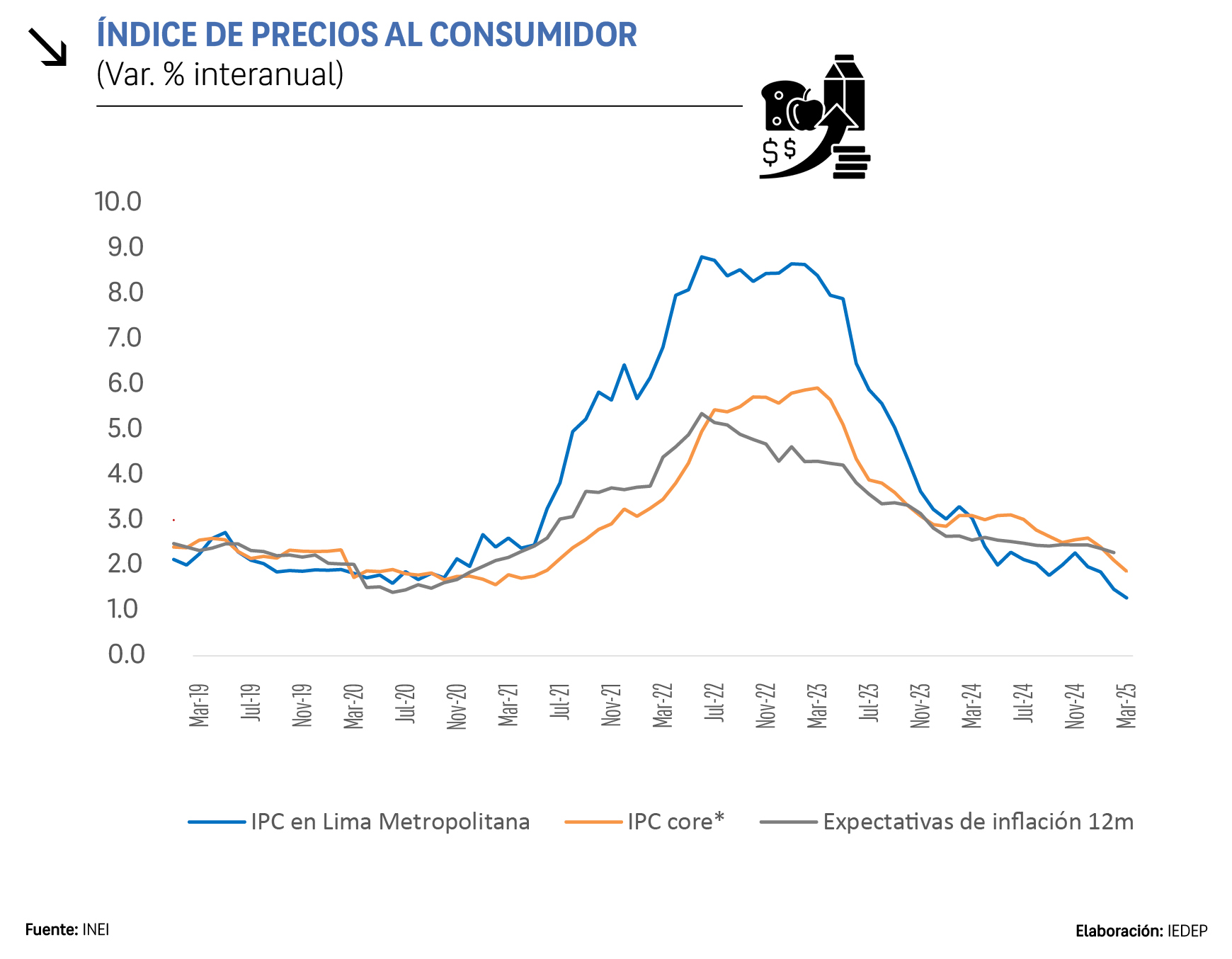 En términos interanuales, la inflación subyacente —que excluye Alimentos y Energía y ofrece una visión más precisa de las presiones inflacionarias estructurales— se mantiene dentro del rango objetivo del Banco Central de Reserva del Perú (BCRP) de entre 1 % y 3 %. El gráfico muestra la convergencia de los principales indicadores: tras alcanzar picos de alrededor de 9% en el IPC general y de 5 % tanto en el IPC subyacente como en las expectativas de inflación en el 2022; en marzo del 2025 estos valores descendieron a 1,3 %, 1,9 %, y 2,3 % respectivamente, todos alineados con el rango meta de 1 % a 3 %.