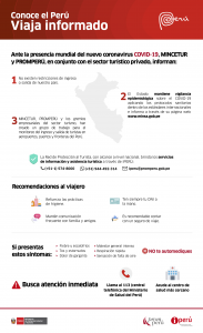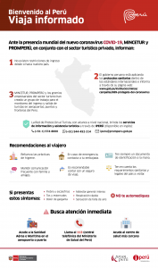 En esa misma línea, el Ministerio de Comercio Exterior y Turismo (Mincetur) emitió una serie de recomendaciones dirigidas a los turistas internos y extranjeros para frenar la propagación del COVID-19 en el territorio peruano.