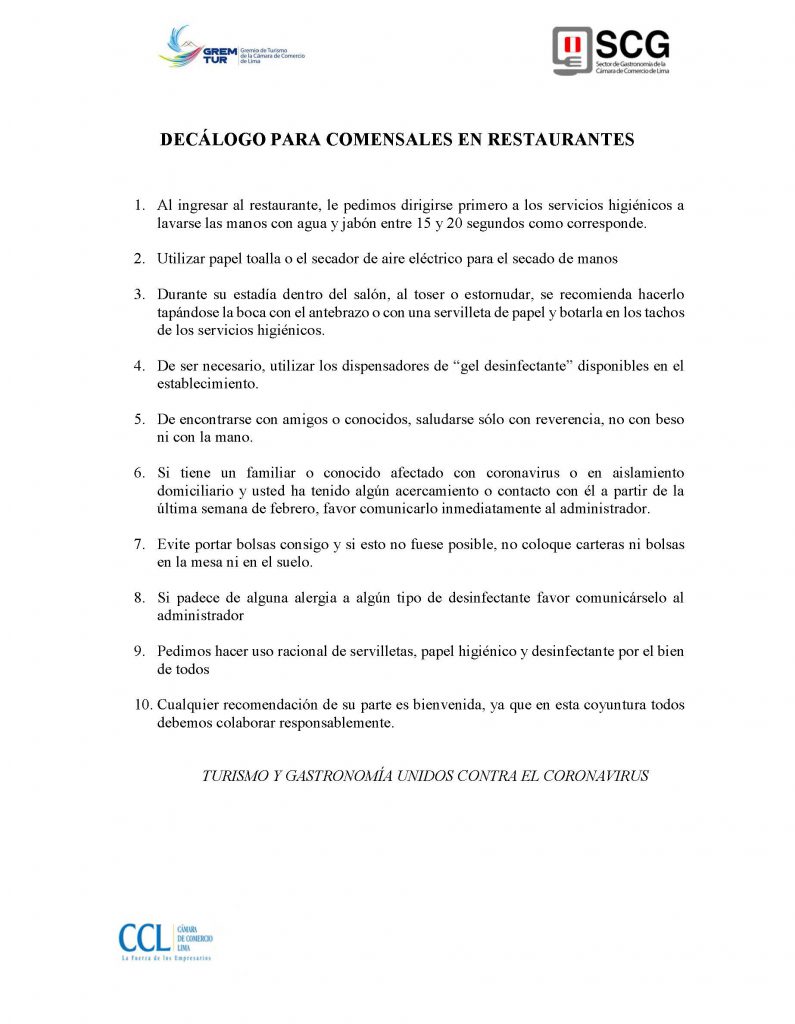 El Sector de Gastronomía del gremio de Turismo de la Cámara de Comercio de Lima emitió una serie de recomendaciones para aquellos asistentes a diversos locales como restaurantes, cafés, restobares y similares.
