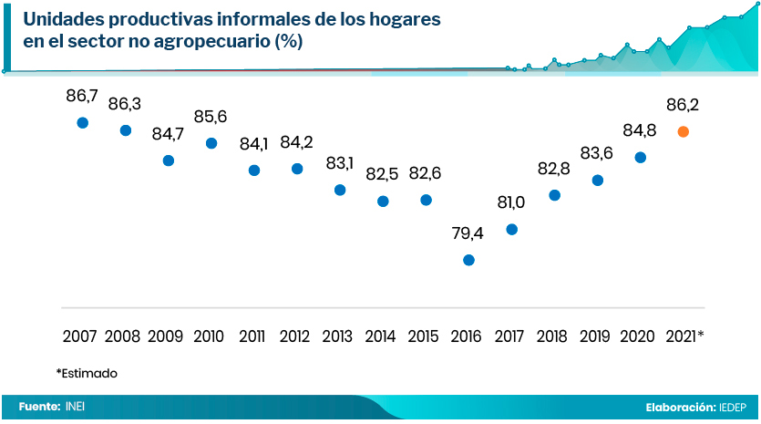 Desde el año 2007 hasta 2016 la participación del sector informal en el total de los negocios iba descendiendo alcanzando un mínimo de 79% en este último año. Sin embargo, a partir de entonces ha escalado sostenidamente retornando a sus niveles de hace quince años.