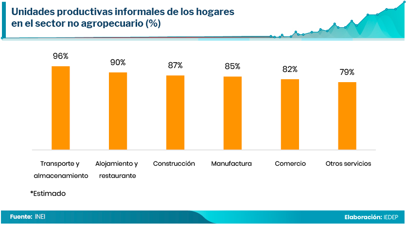 La incidencia del sector informal es de 96% en los negocios del sector Transporte y almacenamiento, del 90% en Alojamiento y restaurantes, del 87% en Construcción, del 85% en Manufactura, del 82% en Comercio y del 79% en Otros servicios. Estas tasas no son una novedad por lo que está pendiente la implementación de una política transversal que apunte a la formalización de los negocios en estos sectores, pero también de políticas direccionadas a cada uno de ellos.