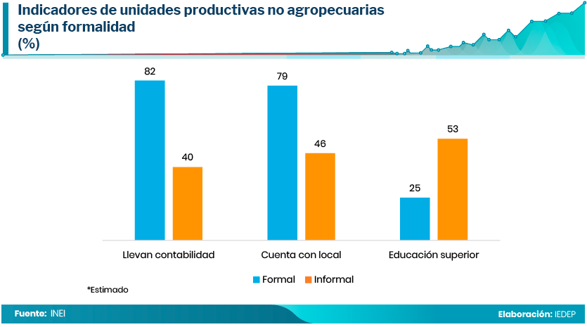 En el sector formal el 79,4% realiza su negocio en un local, mientras que en el sector informal solo el 46,4%. En otras palabras, en el sector informal se realizan más actividades al aire libre, por ejemplo, en vehículos para transporte de personas o mercaderías, labores como ambulantes o en los domicilios de los clientes.