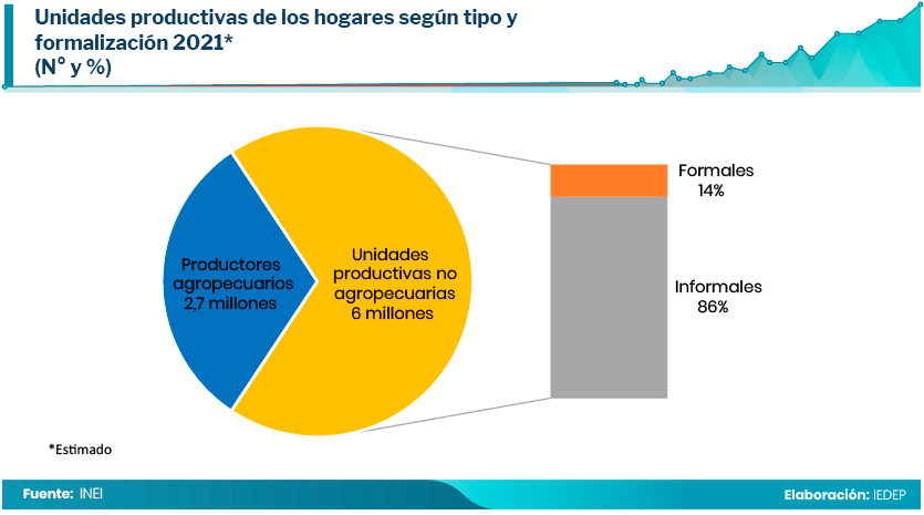 El IEDEP estima que en 2021 habrían operado un total de 8,7 millones de negocios, de los cuales alrededor de 6 millones son no agropecuarios. De este grupo, que será el que se estudiará en el artículo, aproximadamente el 86% son informales.