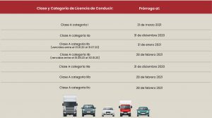 7.- Prorrogan vigencia de licencias de conducir en zonas de cuarentena focalizada.- Con la Res. 025-2020-MTC (09.09.20) se prorroga la vigencia de las licencias de conducir de vehículos automotores de la clase A, cuyo trámite de revalidación debe ser realizado en los gobiernos regionales de Cusco, Moquegua, Puno, Tacna, Amazonas, Ancash, Apurímac, Arequipa, Ayacucho, Cajamarca, Huancavelica, Huánuco, Ica, Junín, La Libertad, Lima (no comprende la provincia de Lima Metropolitana), Madre de Dios y Pasco; y cuyo vencimiento se haya producido entre el 01.01.20 y el 30.10.20, según el cronograma que se indica: