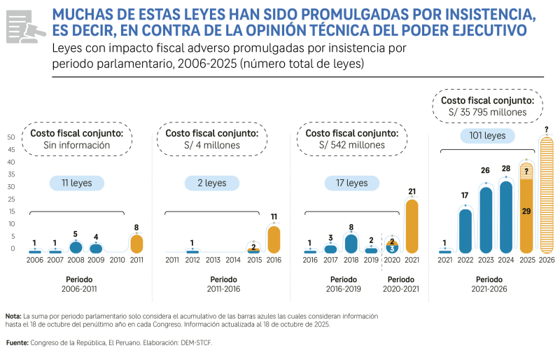 El diagnóstico es alarmante, el actual Congreso ha aprobado 229 leyes con impacto fiscal negativo, de las cuales, 101 fueron promulgadas por insistencia, sin considerar las observaciones técnicas del Poder Ejecutivo ni de las entidades especializadas. Estas normas aprobadas representan un costo fiscal acumulado cercano a los S/ 35 800 millones, monto que pudo haberse reducido si el Ejecutivo y el MEF hubiesen ejercido con mayor firmeza sus atribuciones para impugnar dichas medidas ante el Tribunal Constitucional. Por el contrario, solo el 50 % fueron observadas, evidenciando una marcada pasividad institucional.