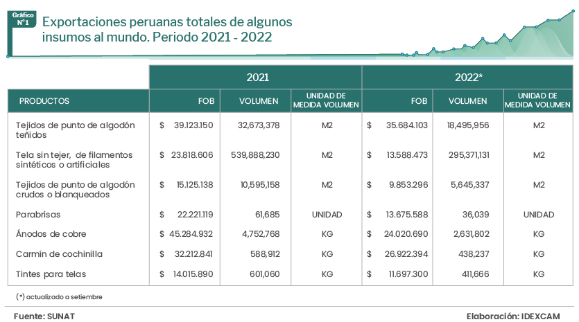 Según la base de SUNAT, identificamos siete insumos de calidad de diferentes sectores económicos que el Perú exporta al mundo. Estos son tejidos de lana peinada, tejidos de lana peinada mezclada con fibras sintéticas, tejidos de lana peinada mezclados con filamentos sintéticos, parabrisas, ánodos de cobre, carmín de cochinilla y tintes para telas.