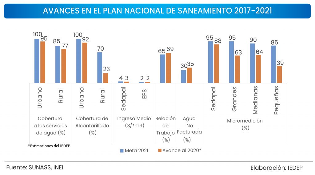 Además, el IEDEP estimó los avances para seis indicadores, a través de un promedio que fue ponderado según el número de conexiones que administra cada EPS con información de Sunass al primer trimestre de 2020. Con base en las cifras de INEI, se evaluaron las metas.