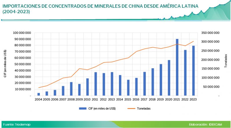 Según Trademap, la importación china de concentrados de minerales desde América Latina para la elaboración de acero y manufacturas ha mostrado un crecimiento constante en las últimas dos décadas, convirtiendo a la región en un proveedor estratégico de minerales esenciales para China.