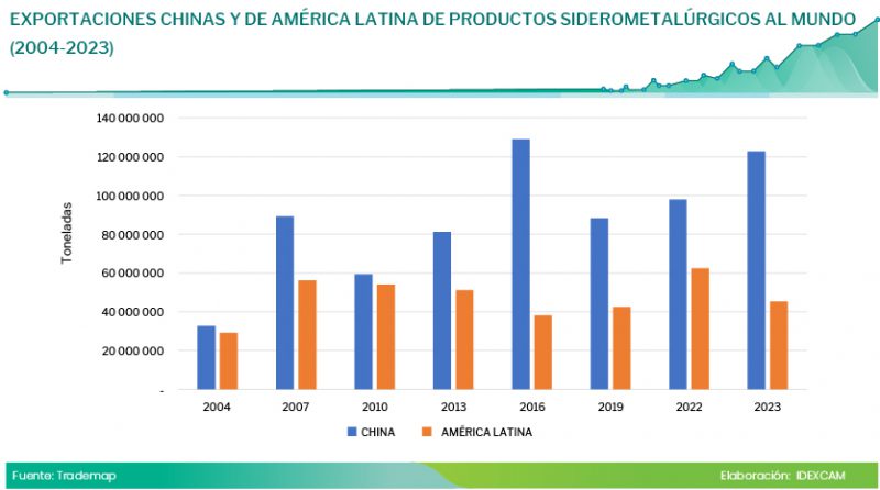 Según Trademap, la brecha entre las exportaciones de productos siderometalúrgicos de China y América Latina ha ido en aumento en los últimos años. Así, en 2004 la mencionada brecha era de solo 11 %, mientras que en 2023 asciende a 63 %.
