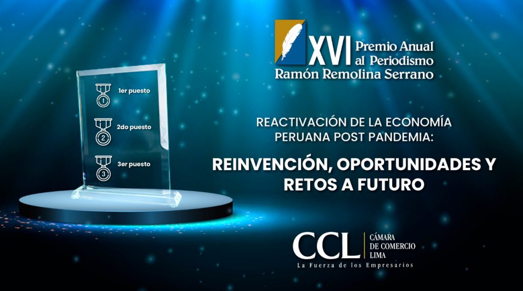 La Cámara de Comercio de Lima (CCL) lanza la XVI edición del Premio Anual al Periodismo “Ramón Remolina Serrano” que este año se denomina “Reactivación de la economía peruana post pandemia: reinvención, oportunidades y retos a futuro”.