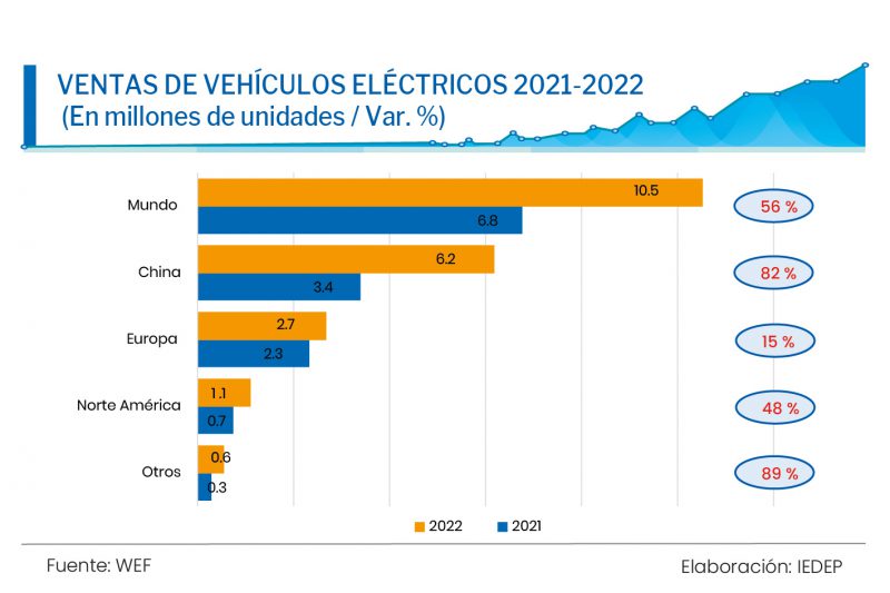 Según el Foro Económico Mundial, las ventas de vehículos eléctricos en el mundo al cierre de 2022 crecieron en 56 % con respecto a 2021. Tanto China (con un incremento del 82 %) como Europa (con un aumento del 15 %) son los mercados que concentran las mayores ventas a nivel global.