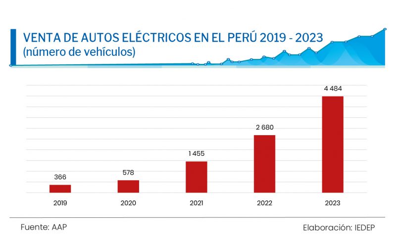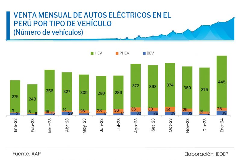 Según la Asociación Automotriz del Perú (AAP), desde enero 2019 hasta enero 2024, existe un stock de un poco más de 10 000 vehículos eléctricos, de los cuales el 95 % son híbridos (HEV y PHEV), mientras que el 5 % restante corresponde a los vehículos netamente eléctricos (BEV).