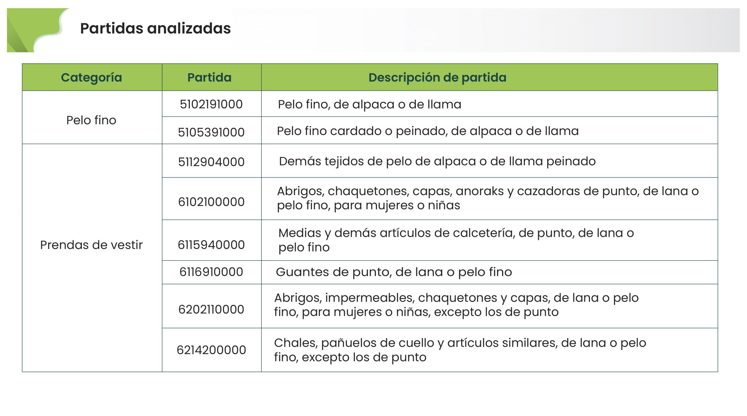 El Instituto de Investigación y Desarrollo de Comercio Exterior de la Cámara de Comercio de Lima (Idexcam) analizó las exportaciones peruanas de las partidas pertenecientes a pelo fino, tejidos y prendas de vestir de pelo fino para evaluar su comportamiento y el efecto de la pandemia en los envíos de estos productos. Ello teniendo en cuenta las partidas cuyas exportaciones superaron US$ 1 millón en el 2020.