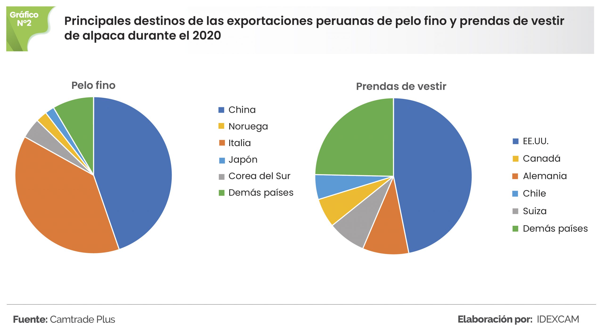 Cabe resaltar que, las exportaciones de materia prima tienen como destinos países que confeccionan sus propias prendas. Por ejemplo, el principal destino en el 2020 fue China, con el 45% de participación. Este país es conocido por tener una mano de obra relativamente baja en comparación con otros países.