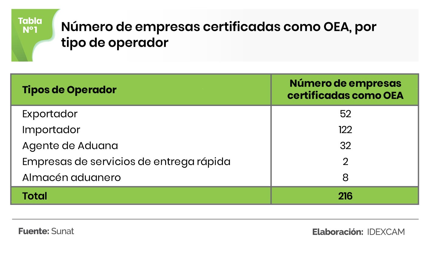 Al día de hoy, según datos de la Sunat, existen 216 empresas que cuentan con la certificación de Operador Económico Autorizado (OEA), de las cuales 52 se dedican al rubro de la exportación, 122 son importadoras, 32 son agentes de aduanas, dos son empresas de servicio de entrega rápida y ocho son almacenes aduaneros.
