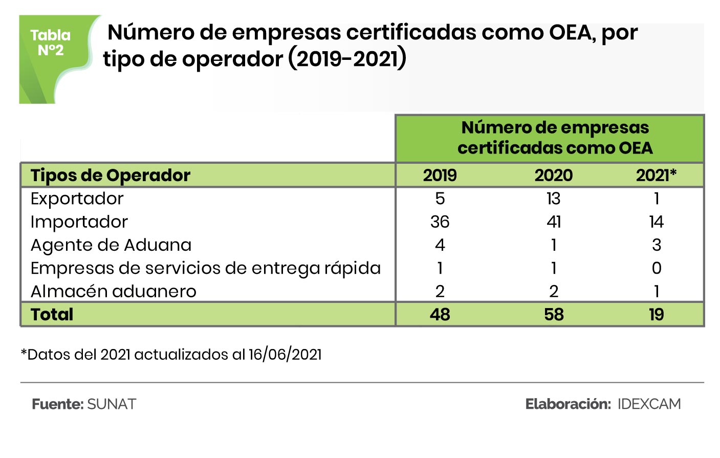 Por otro lado, según los datos de Sunat disponibles al 16 de junio del presente año, el número de empresas con certificación OEA, en lo que va del 2021, asciende a 19; siendo una empresa perteneciente al rubro exportador.