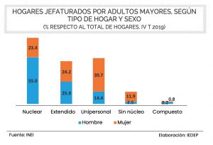 Con respecto al tipo de hogar que conducen los adultos mayores, el 43,5% corresponde a hogares nucleares, que están constituidos por la pareja, hijas, hijos o sin hijos; mientras que el 25,3% corresponde a hogares extendidos; es decir, que en ellos viven otros parientes, además del cónyuge y los hijos. Un dato por destacar es que 23,6% del total corresponde a los hogares unipersonales; es decir, son adultos mayores que viven solos y a quienes les resulta inevitable salir de casa para realizar su abastecimiento de alimentos o productos de primera necesidad.