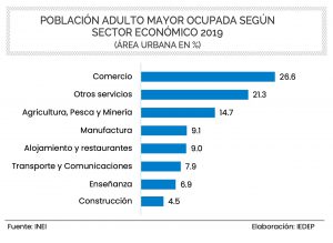 En el Perú, los adultos mayores gozan de una alta participación en la Población Económicamente Activa (PEA). Dicho ratio alcanza el 60,6%, con mayor presencia en hombres (71,9%) frente a mujeres (50,5%).