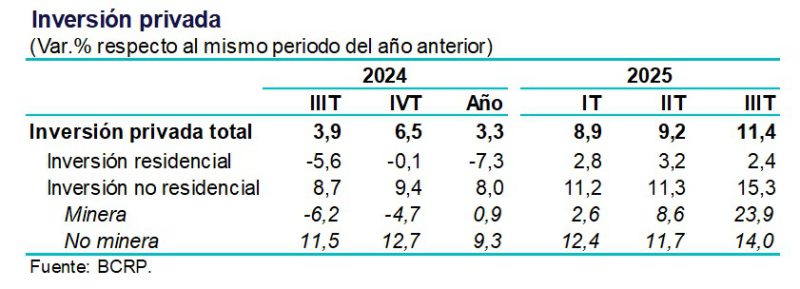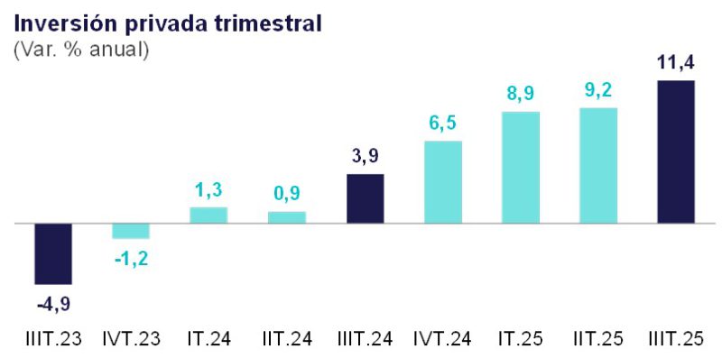 La inversión privada mantuvo su dinamismo en el tercer trimestre de 2025, registrando una expansión de 11.4 %, lo que representó una aceleración respecto al trimestre previo (9.2 %).