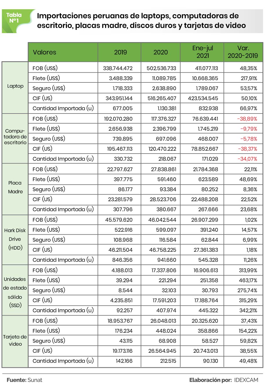 En conclusión, a excepción de las computadoras de escritorio, las importaciones peruanas de laptops y componentes de computadora (placas madre, discos duros y tarjetas de video) aumentaron frente a los valores registrados durante el 2019.