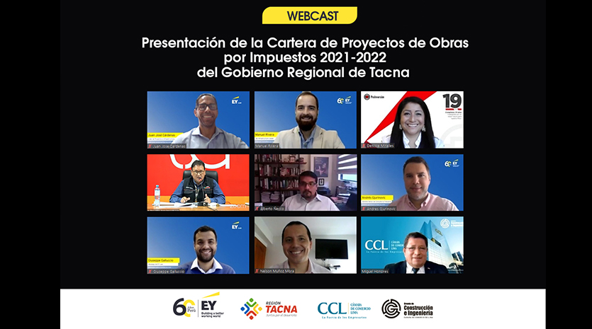 El Gobierno Regional de Tacna, el Gremio de Construcción e Ingeniería de la CCL e EY Perú, desarrollaron el webcast Presentación de Cartera de Proyectos de Obras por Impuestos 2021–2022 del Gobierno Regional de Tacna. El objetivo fue unir esfuerzos públicos y privados para promover la inversión privada en infraestructura pública.