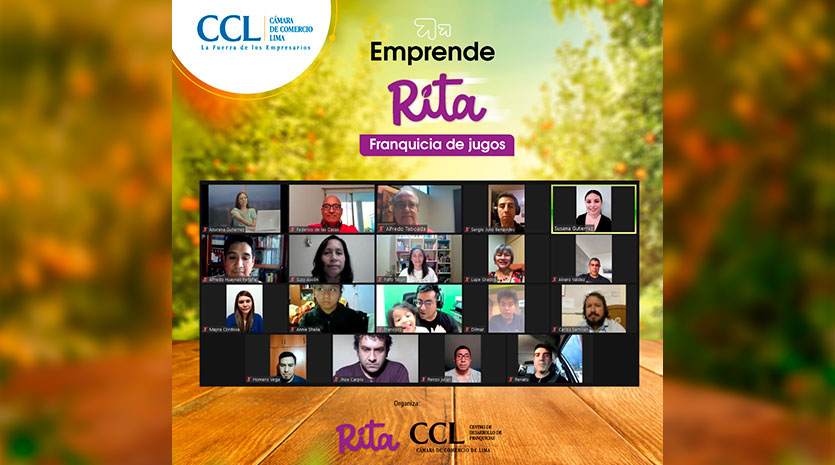 El Centro de Desarrollo Empresarial de Franquicias de la CCL, liderada por Alfredo Taboada, junto a Franquicias Rita, co-organizaron el webinar Emprende con Rita: Franquicia de jugos altamente tecnológica. La expositora fue Azucena Gutiérrez, gerente general y fundadora de Rita, quien durante la sesión dio a conocer sobre los beneficios de invertir y emprender con este modelo de negocio, el que, pese a la pandemia, se ha mantenido a flote de manera óptima y sus expectativas de crecimiento son bastante favorables.