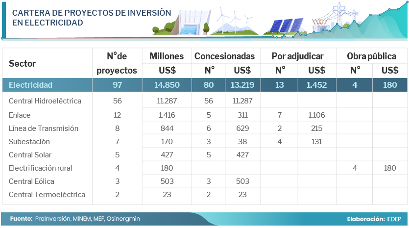 El IEDEP ha identificado 97 megaproyectos en el sector electricidad para el periodo 2022-2028, con un compromiso de ejecución por US$ 14.850 millones. Es importante señalar que 89 de dichos proyectos corresponden a fuentes de energía convencionales. Entre ellos, 56 proyectos se desarrollarán en centrales hidroeléctricas, seguido de 20 proyectos entre enlace y línea de transmisión, cuatro en electrificación rural y dos centrales termoeléctricas.