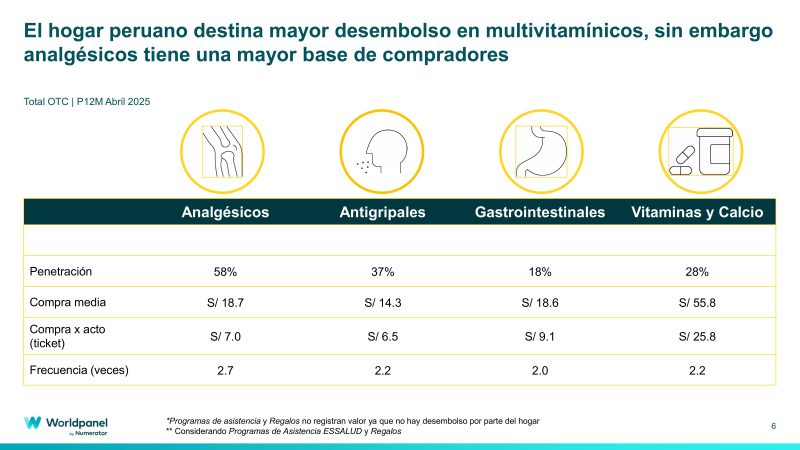 Entre diversos datos, el estudio revela que la categoría de analgésicos tiene una penetración del 58 %, mientras que los antigripales están presentes en 37 % de hogares peruanos. Vitaminas y calcio tienen una penetración de 28 %, y medicamentos gastrointestinales del 18 % en el año móvil a abril de 2025. Por otra parte, el ticket promedio de compra de vitaminas llega a S/25.8, superando ampliamente a los gastrointestinales (S/ 9.1), analgésicos (S/ 7), y antigripales (S/ 6.5).