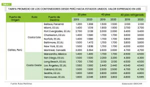 En mayo de 2019, el Instituto de Investigación y Desarrollo de Comercio Exterior de la Cámara de Comercio de Lima (Idexcam) realizó un estudio utilizando esta aplicación y encontró la lista de precios del traslado contenedores teniendo como origen el puerto del Callao y como destino, algunos puertos de Estados Unidos, ubicados en la costa este y oeste. Dichos precios promedios han sido comparados con los precios brindados en la actualidad (ver tabla 1) y se puede corroborar un aumento en las tarifas promedio. Por ejemplo, la tarifa media del contenedor de 20 pies desde el puerto del Callao hasta New York ha tenido una variación de US$ 338 entre el 2019 y el 2020. Por otro lado, la tarifa promedio de los contenedores de 40 pies y 40 pies refrigerados no ha variado, excepto el flete hasta Vancouver, el cual pasó de US$ 4.800 a US$ 5.665. Cabe resaltar que, los precios mostrados en la aplicación son precios aproximados y que, además, varían según la línea naviera.