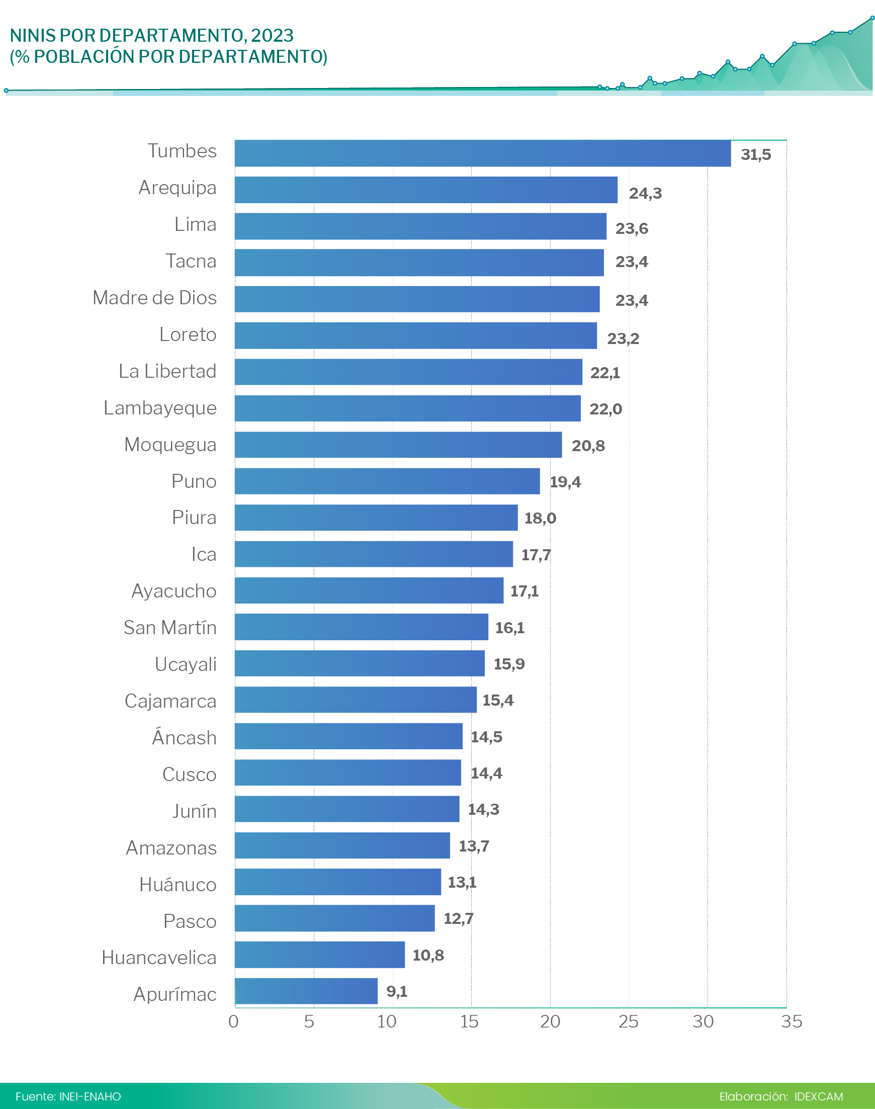 De otro lado, la distribución geográfica de los ninis muestra una concentración significativa en Lima, donde hay 657 000 de estos jóvenes, representando el 43,3 % del total nacional. Otras regiones con alta concentración incluyen La Libertad (6,8 %), Arequipa (5,5 %) y Piura (5,3 %), reflejando una cierta correlación con otras variables sociales como los niveles de inseguridad en estas áreas. Por otra parte, si observamos el peso de los ninis en cada departamento, 1 de cada 3 jóvenes de Tumbes son de esta condición, una cifra preocupante para un departamento tan pequeño y de poca población. Del mismo modo, en ocho departamentos del país se observa que entre el 20 % y 25 % de sus jóvenes no están estudiando ni trabajando; entre estos figuran Madre de Dios y Tacna (23,4 % cada uno), Loreto (23,2 %) y Moquegua (20,8 %).
