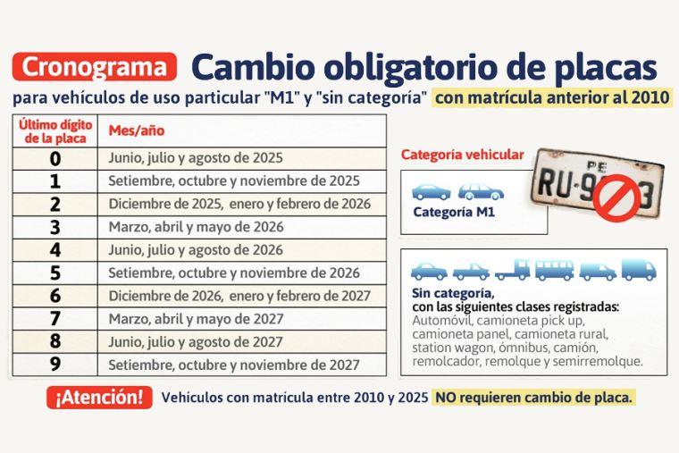 Los vehículos con matrícula anterior al 1 de enero de 2010 que aún conservan el modelo antiguo de placa, tendrán la obligación de cambiarla por una nueva, según el cronograma del proceso general extraordinario de cambio de placas aprobado por el Ministerio de Transportes y Comunicaciones (MTC), orientado a mejorar la identificación vehicular y actualizar el parque automotor.
