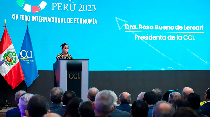 La presidenta de la Cámara de Comercio de Lima (CCL), Rosa Bueno de Lercari, durante sus palabras de bienvenida del XIV Foro Internacional de Economía Quo Vadis Perú 2023: Por una Nueva Descentralización con Desarrollo Regional Equilibrado y Sostenible. «¿Vamos a seguir descentralizando la corrupción?», señaló que el gremio empresarial tiene una visión de desarrollo del país que implica trabajar en una agenda de largo plazo, incidiendo en los cambios estructurales que nos proyecten a ser un país más justo y equitativo, fortaleciendo nuestra democracia y el Estado de derecho.