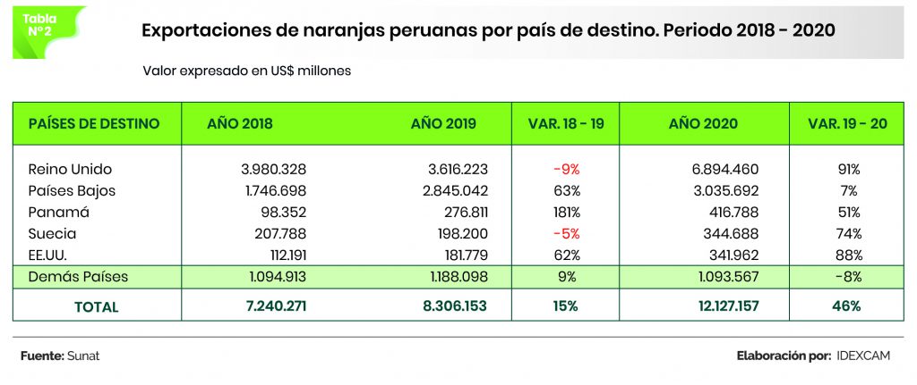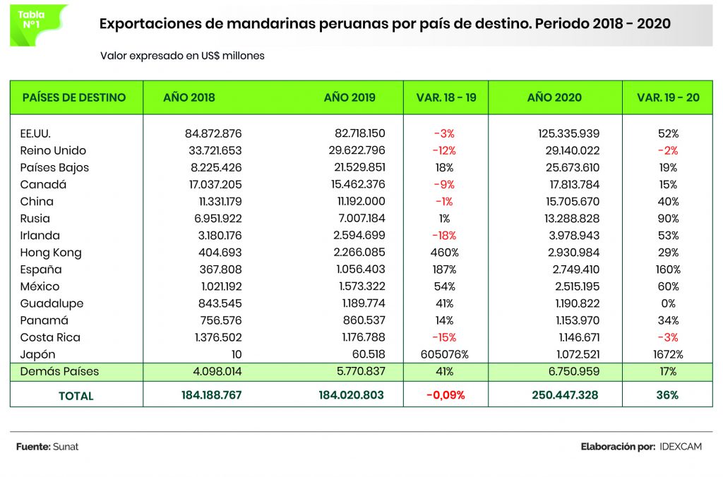 Según la base de datos de Sunat, las mandarinas y las naranjas peruanas tuvieron un 2020 exitoso, con un crecimiento en el valor de sus exportaciones del 46% y 36%, respectivamente. Los principales mercados de destino de la mandarina en el 2020 fueron Estados Unidos, país cuyo valor exportado llegó a crecer en 52%; Reino Unido, el cual disminuyó en 2%; Países Bajos, +19%; y Canadá, +15%.