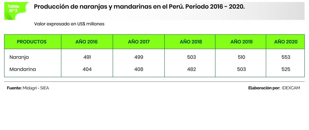 La producción de mandarinas, al igual que la de naranjas en el Perú, ha crecido de manera constante desde el 2010. Las mandarinas, han registrado un incremento interanual del 9%, mientras que las naranjas del 3%.