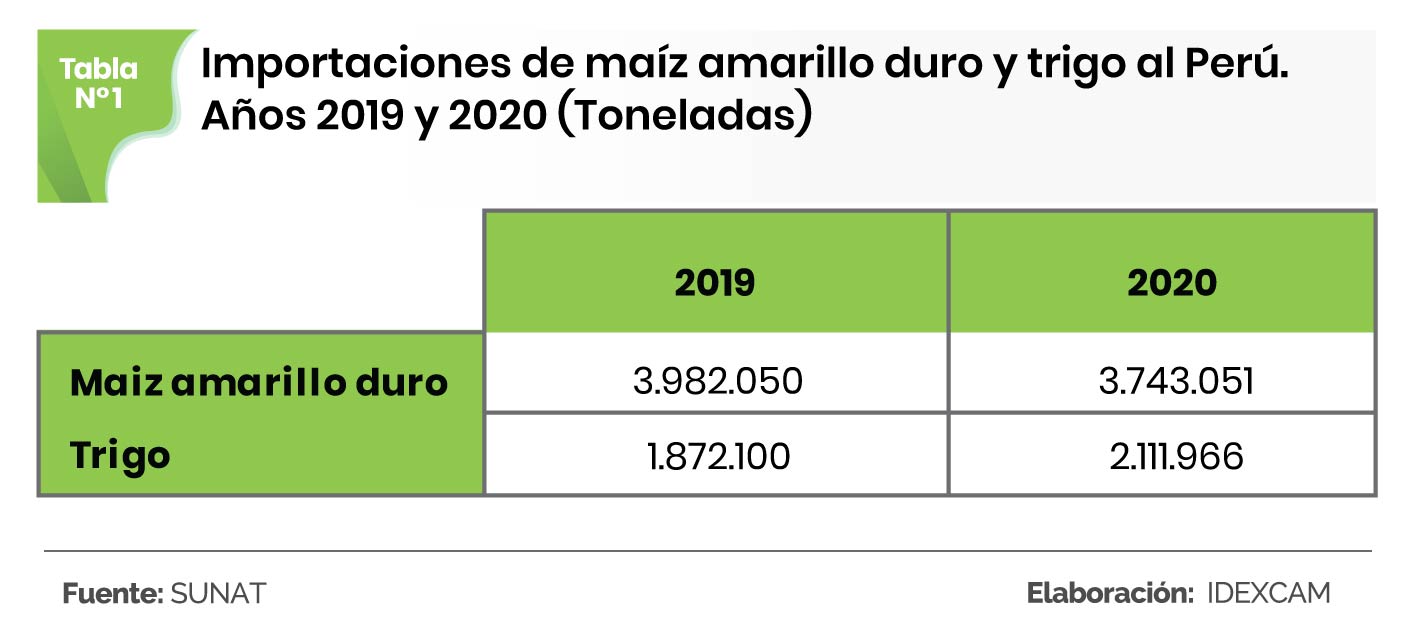 Para el caso del maíz amarillo duro, el Perú importó en 2019 y 2020, 3,98 y 3,74 millones de TM, respectivamente, mientras que la producción nacional alcanzó, entre julio del 2019 y agosto del 2020, un total de 1,13 millones de TM.