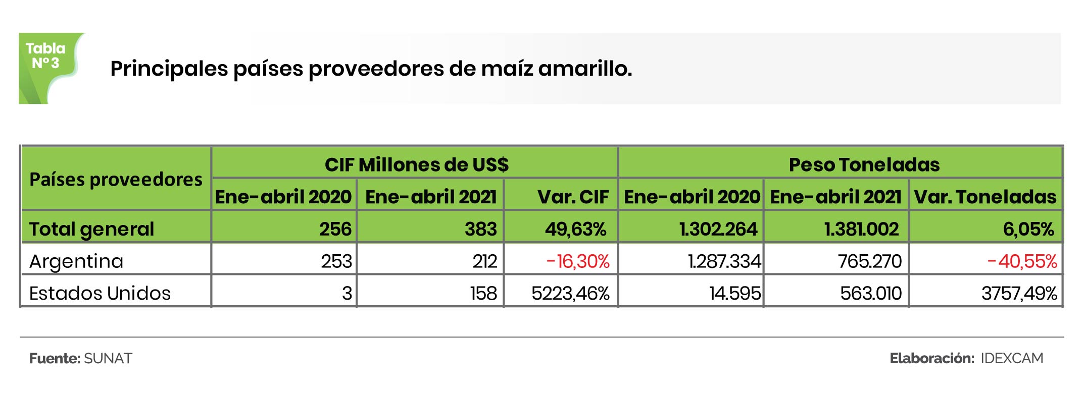 Argentina fue el principal proveedor de maíz amarillo duro del Perú, con 765.270 TM valorizadas en US$ 212 millones. Le siguió Estados Unidos, con 563.010 TM por un monto de US$ 158 millones.