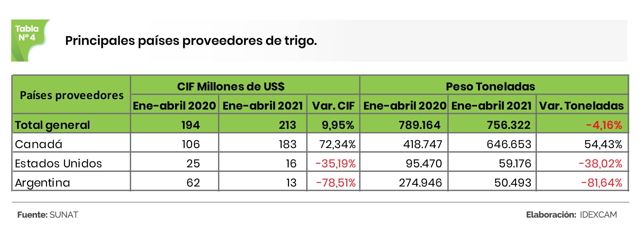 Respecto a las importaciones de trigo entre enero y abril del 2021, esta ascendió a 756.322 TM, por un valor de US$ 213 millones, montos que evidenciaron una caída de 4,16%, en cuanto a peso, y un aumento de 9,95%, en cuanto a valor, respecto a similar periodo del 2020.