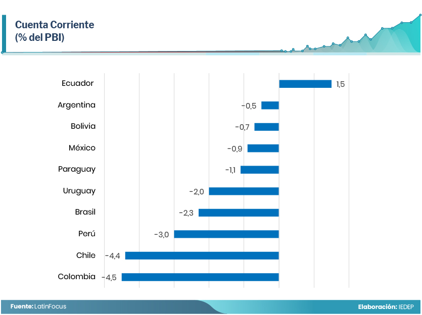 Chile y Colombia comparten el déficit externo más elevado de la región, con -4,4% y -4,5% del PBI, respectivamente. Si bien no son magnitudes que presagien una crisis, estos déficits deberían ser controlados porque de incrementarse, obligaría a estos países a aplicar políticas de ajuste en desmedro de su crecimiento. Ambas naciones proyectan una apreciación de sus monedas respecto al dólar del orden del 2,2%.
