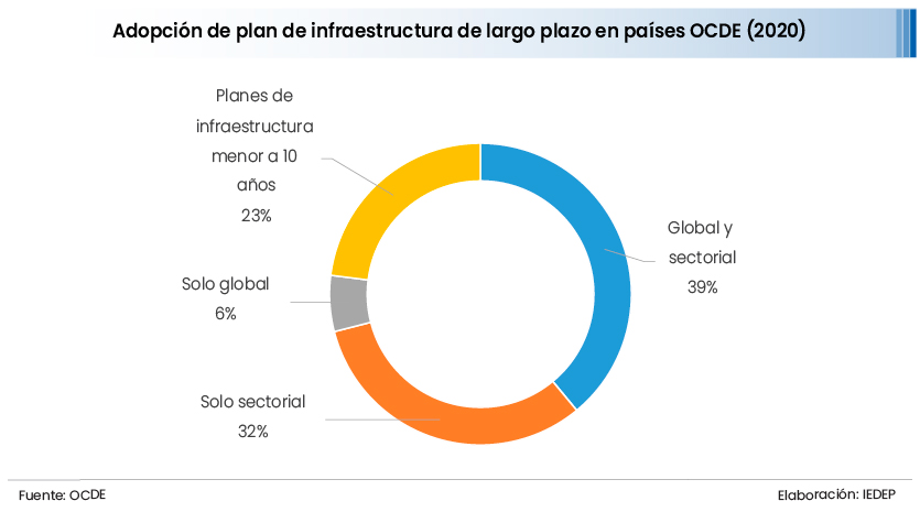 Con base en su Encuesta de Gobernanza de la Infraestructura 2020, la Organización para la Cooperación y el Desarrollo Económicos (OCDE) identifica que el 39% de sus países miembros adoptó un plan de infraestructura de largo plazo, tanto global como sectorial; el 32% solo sectorial; el 6% solo global; y el 23% de dichos países adoptó un plan con un horizonte inferior a los diez años.