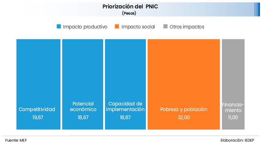El ranking fue elaborado con base en tres pilares. El pilar denominado impacto productivo (ponderación de 0,57) consta de los subpilares: (i) potencial económico, que incluye los indicadores multiplicador del gasto privado y área de influencia; (ii) competitividad, que incluye los indicadores multiplicador de la inversión privada, potencial de complejidad económica según región, brecha de acceso según provincias; (iii) capacidad de implementación, que comprende los indicadores nivel de estudio del proyecto y nivel de ejecución de la inversión pública del sector.