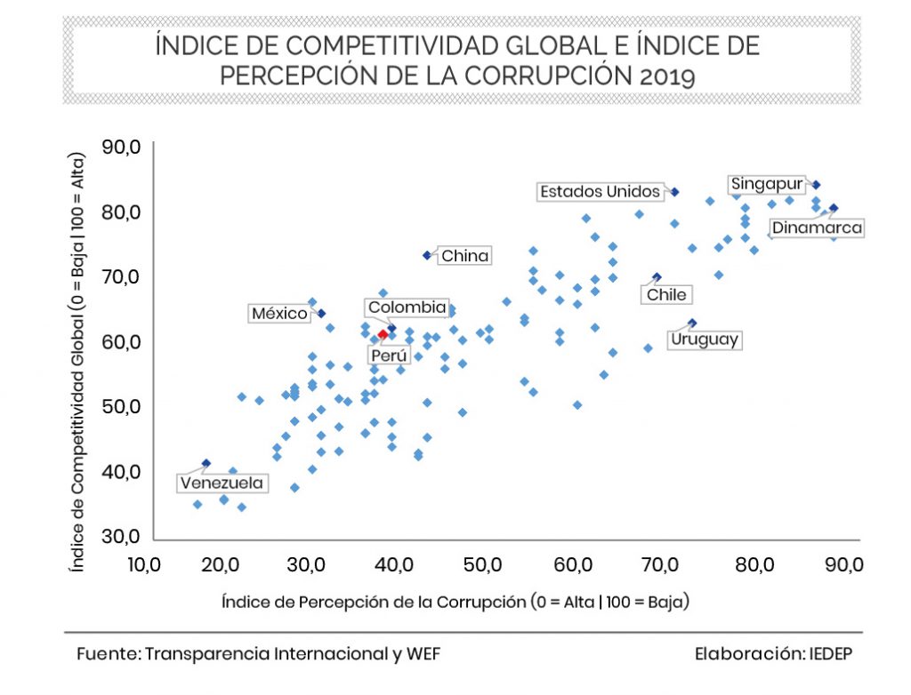 La corrupción se constituye en una fuerte restricción para la mejora de la productividad – competitividad de los países. Al respecto, el Instituto de Economía y Desarrollo Empresarial (IEDEP) de la Cámara de Comercio de Lima refiere que sus efectos microeconómicos en el ambiente de negocios; en la decisión de inversión o de tributar y su impacto macroeconómico en el volumen y la calidad del gasto público; y desigualdad del ingreso y riesgo país van minando la confianza en las instituciones, provocando una inestabilidad política y económica que es muy difícil de resolver en el corto plazo.