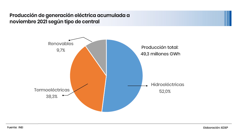 La producción peruana de electricidad ascendió a 49,3 millones de gigavatios-hora (GWh) al mes de noviembre 2021, según cifras del Comité de Operación Económica del Sistema Interconectado Nacional (COES), de los cuales el 52% provino de las centrales hidroeléctricas, el 38,3% de las centrales termoeléctricas (que usan petróleo, gas y carbón) y el 9,7% de centrales con RER, siendo principalmente eólicas y solares.