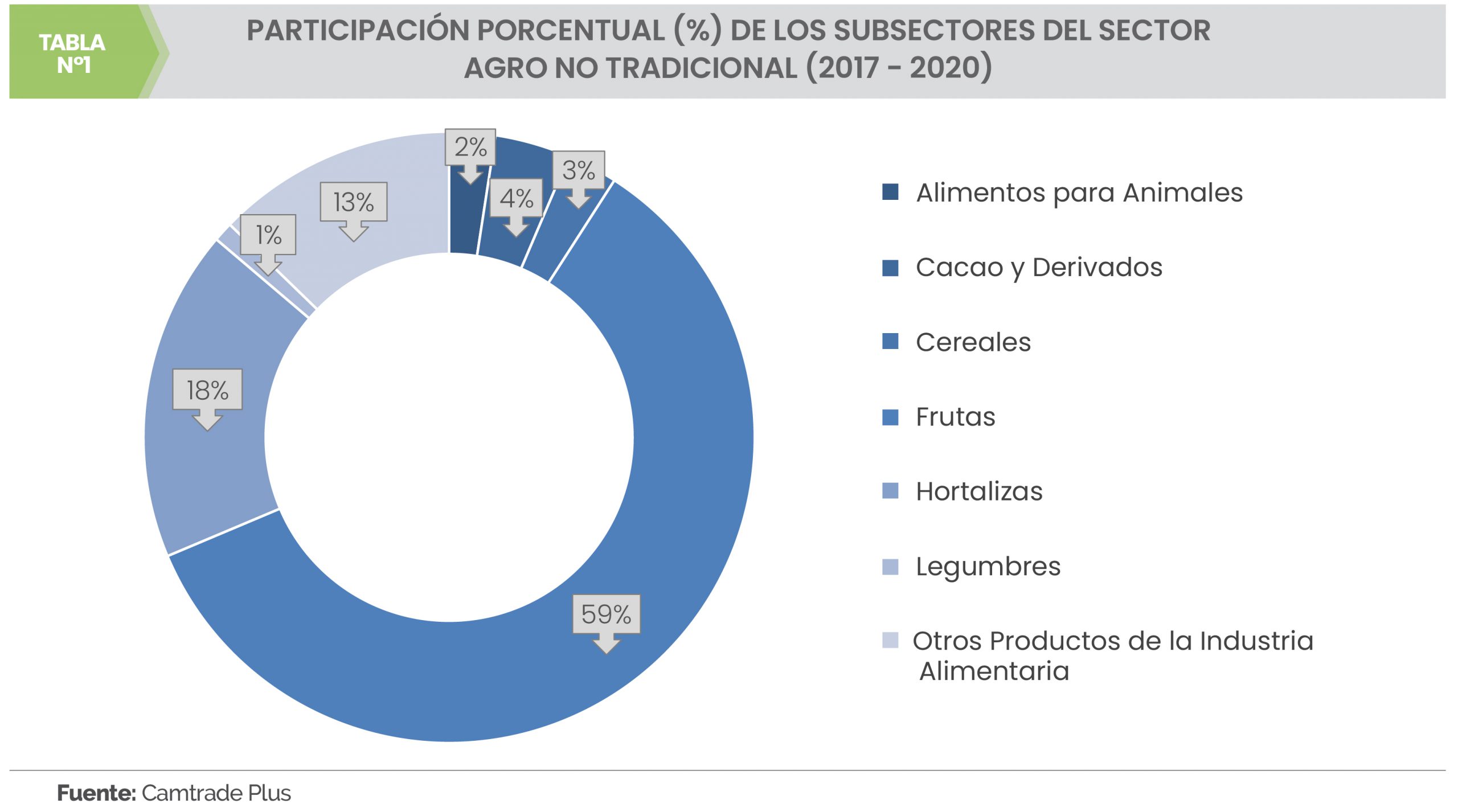 En la Tabla 1, se puede apreciar la participación porcentual de los subsectores del sector agro no tradicional. Como muestra el gráfico, dentro del sector agro no tradicional, resalta el rol de los subsectores de frutas y hortalizas. Es importante recalcar que la potente industria agrícola peruana ocupa una superficie de 180.000 hectáreas, sobresaliendo las zonas costeras.