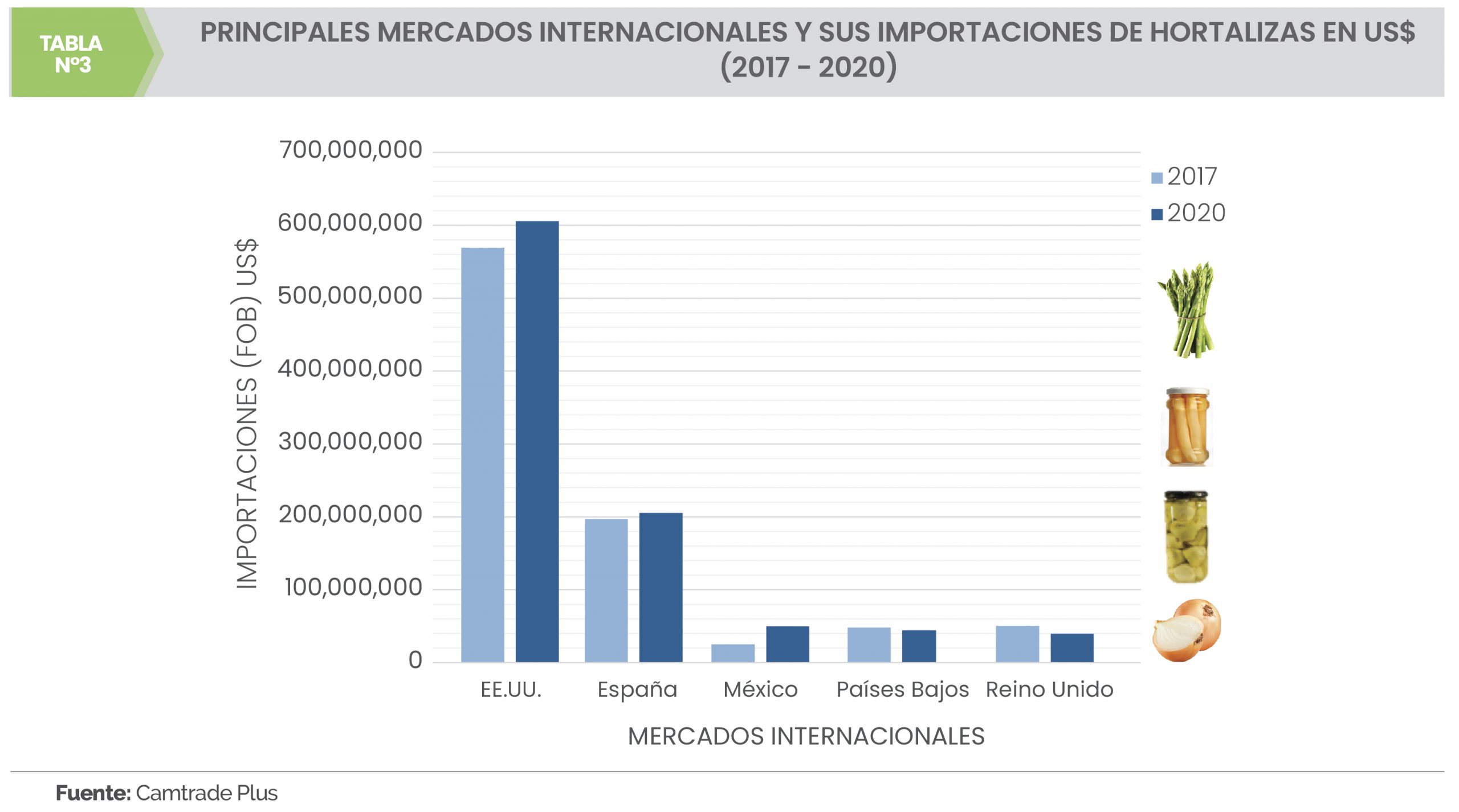 El principal importador de hortalizas peruanas es Estados Unidos, que concentra el 50% de las ventas de nuestro país. A este mercado se le vende principalmente espárragos frescos (43,37%), cebollas (10,89%) y alcachofas en conservas (10,33%).