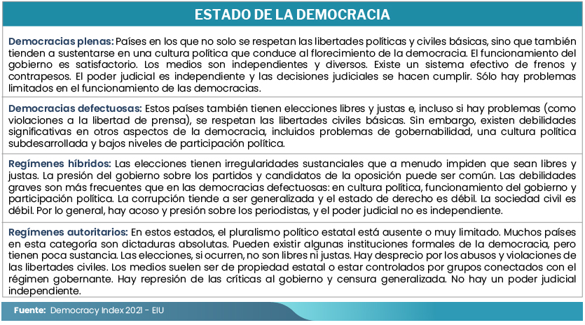 Por esta razón, EIU elabora anualmente el Índice de Democracia (ID) y para el 2022 calificó el estado de la democracia en 167 países del mundo. El ID se calcula desde el 2006 y basa su estudio en 60 indicadores agrupados en cinco categorías: (i) Proceso electoral y pluralismo; (ii) Libertades civiles; (iii) Funcionamiento del gobierno; (iv) Participación política; y (v) Cultura política. Promediando los valores en una escala de 0 al 10. Así, EIU pretende determinar el rango de democracia, ubicando a los países en uno de cuatro regímenes: Democracia plena (8 y 10 puntos), Democracia defectuosa (6 y 8 puntos), Régimen híbrido (4 y 6 puntos) y Autoritario (0 y 4 puntos).