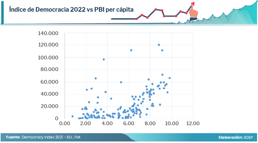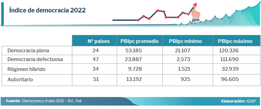 Lo interesante de los resultados obtenidos a través del estudio, es que muestran que aquellos países en los que rige una democracia plena alcanzan un mayor bienestar económico, medido por el PBI per cápita en dólares de paridad de poder de compra. Esto no solo se ve en el resultado promedio de los países, sino también en el rango mínimo y máximo resultante. En el caso de los países con democracia plena, el PBI per cápita promedio es de US$ 53.185, y el intervalo en que fluctúa dicho indicador en los 24 países considerados se ubica entre los US$ 21.107 y US$ 120.326. Aquí destacan países como Noruega, Nueva Zelanda, Suecia, Suiza, Luxemburgo y los sudamericanos Uruguay y Chile.